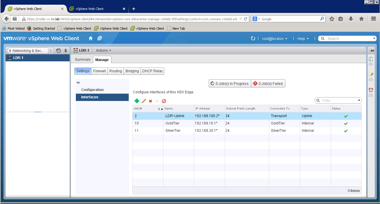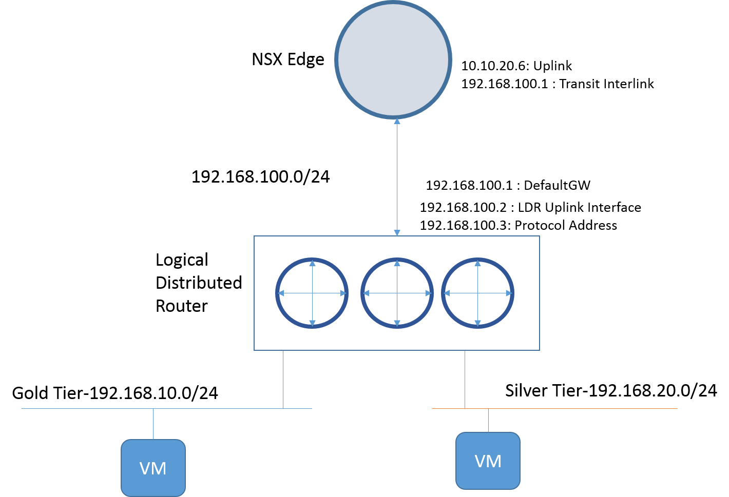Logical Distributed Router provides IP routing for VM to VM traffic within Datacenter (aka East to West traffic). In this scenario, we have two tiers (Gold and Silver tier) that require routing between them. We will use LDR to get routing working between them.