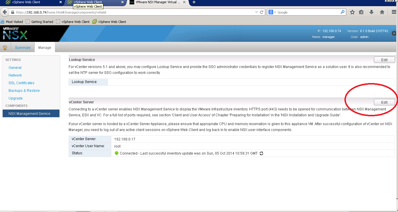 The default user account is admin/default. Under Manage Tab, select NSX Management Service and click on Edit button as shown below