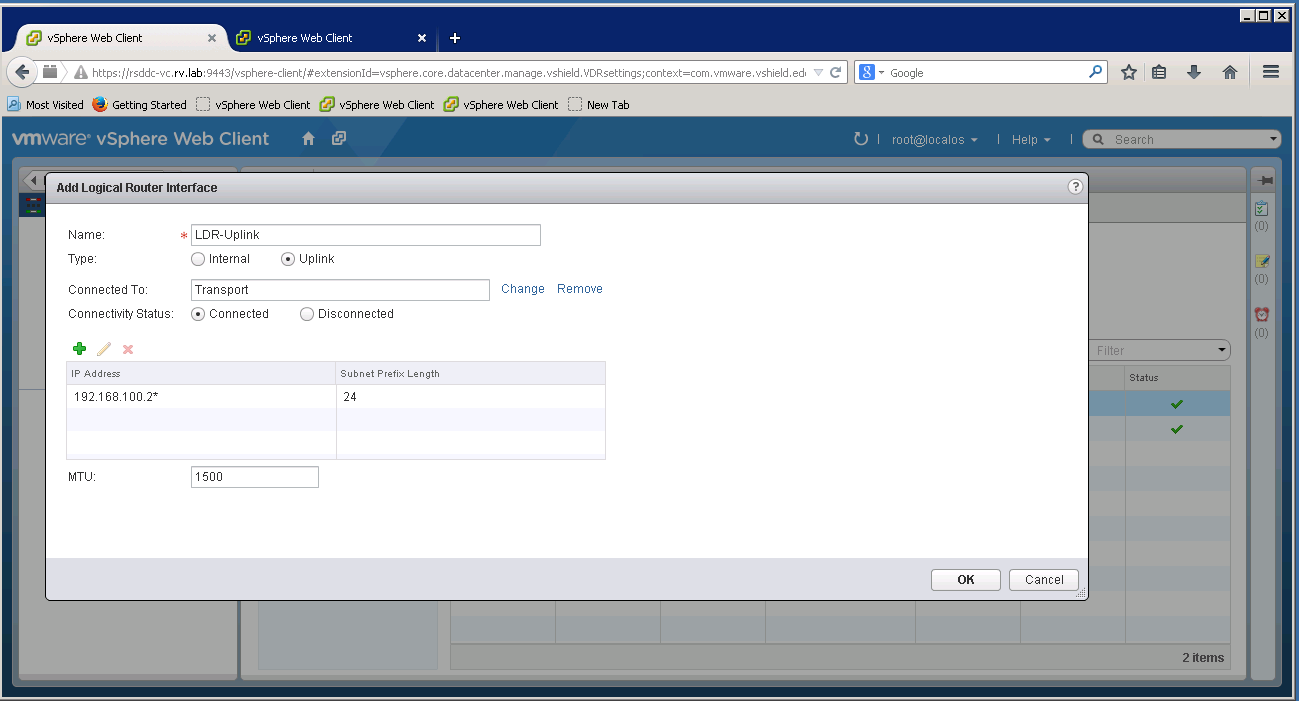 For NSX Edge Uplink, we set address 10.10.20.6 and 192.168.100.1 as internal link address