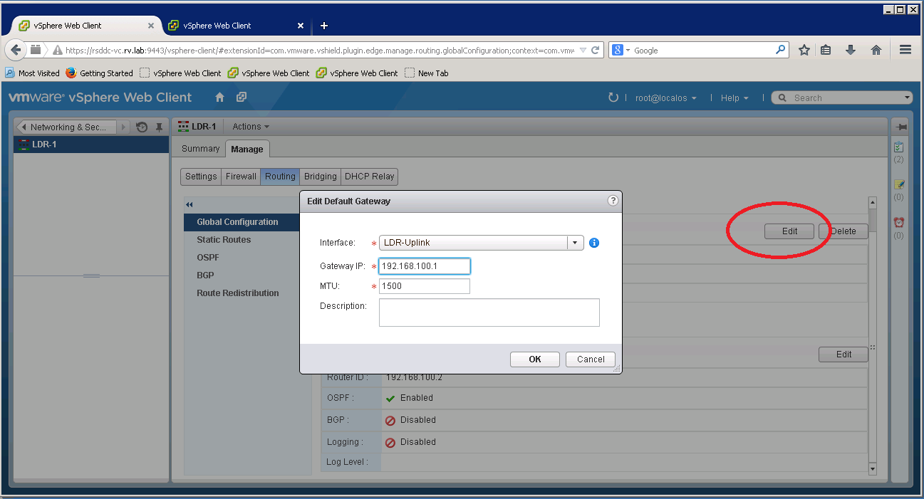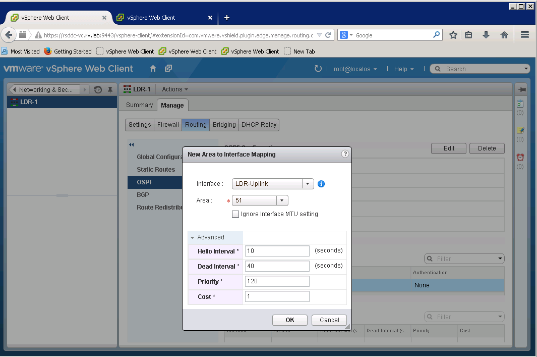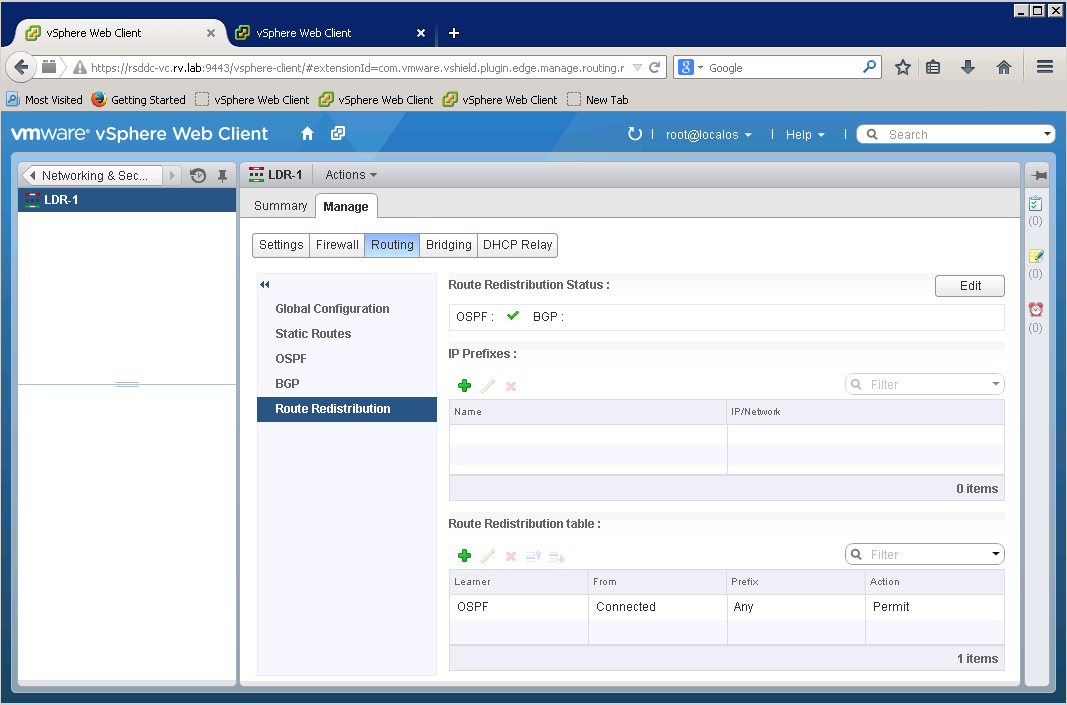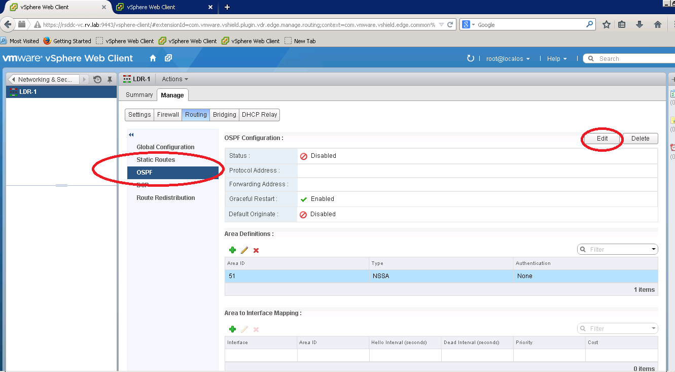 Go to tab created for new NSX Edge (LDR-1), under Manage, you can see OSPF section
