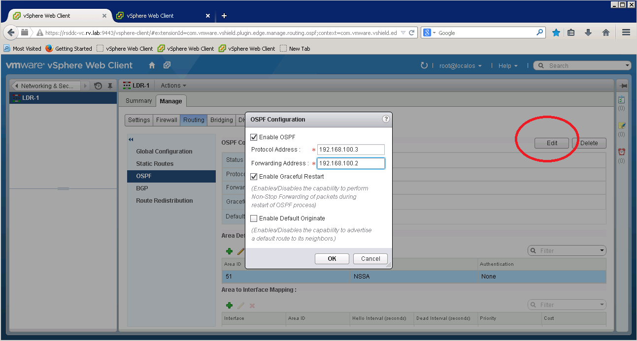 We are setting Forwarding Address as 10.10.20.5. Note this is same address as LDR-Uplink Interface for LDR. The protocol address is set to 10.10.20.6.
