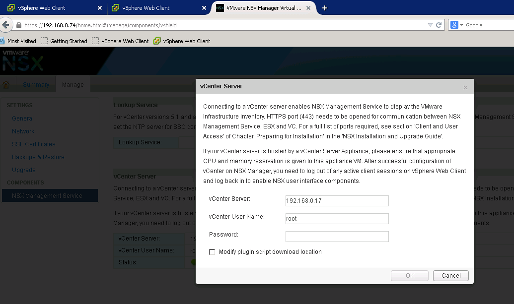 After deploying NSX Manager, it is time to connect NSX Manager to Virtual Center. Login into NSX Manager Web UI (https://<nsxipaddress>)
