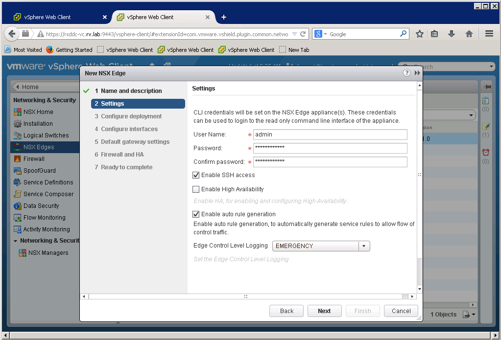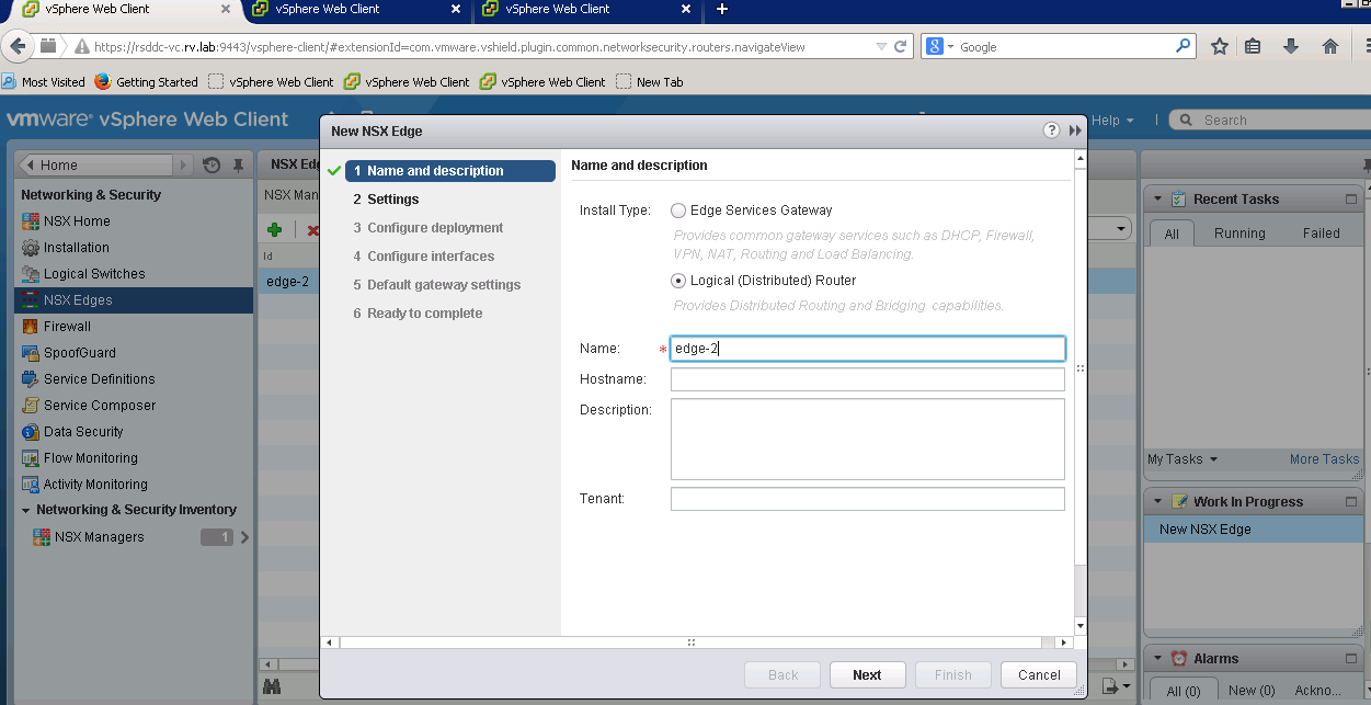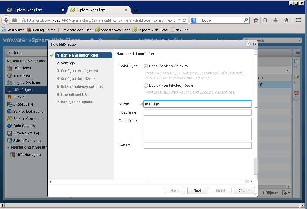 NSX Edge deployment is simple and follows the same procedure as NSX LDR. On NSX Edges tab, click green “+” sign to open New NSX Edge Dialog