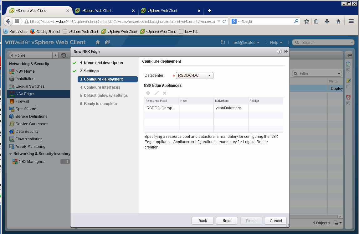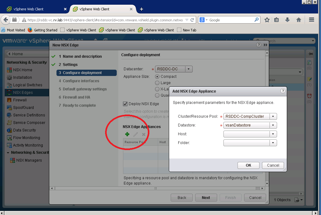 Select the Datacenter to deploy NSX Edge, in our case, we only have one Datacenter RSDDC-DC. Also we choose Compact Appliance size for the lab deployment.