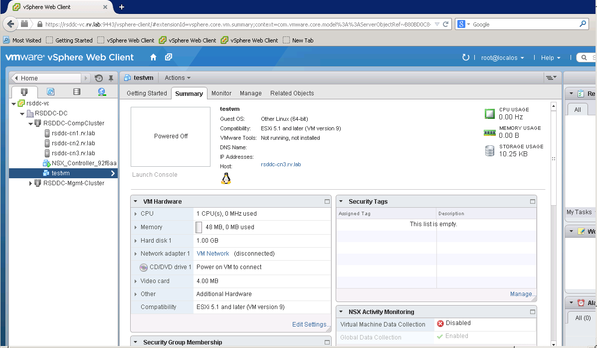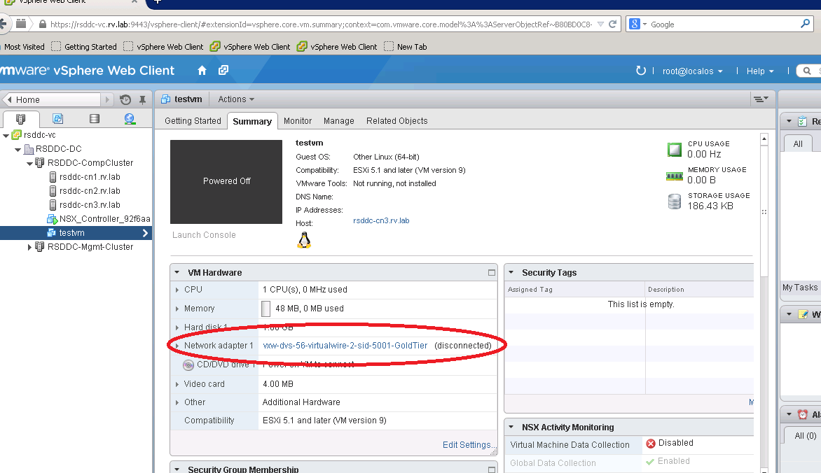 Now we are ready to provision VMs to new logical switches created. I have test VM on RSDDC-COMP-Cluster and let us assign it to Gold Tier and power it on!